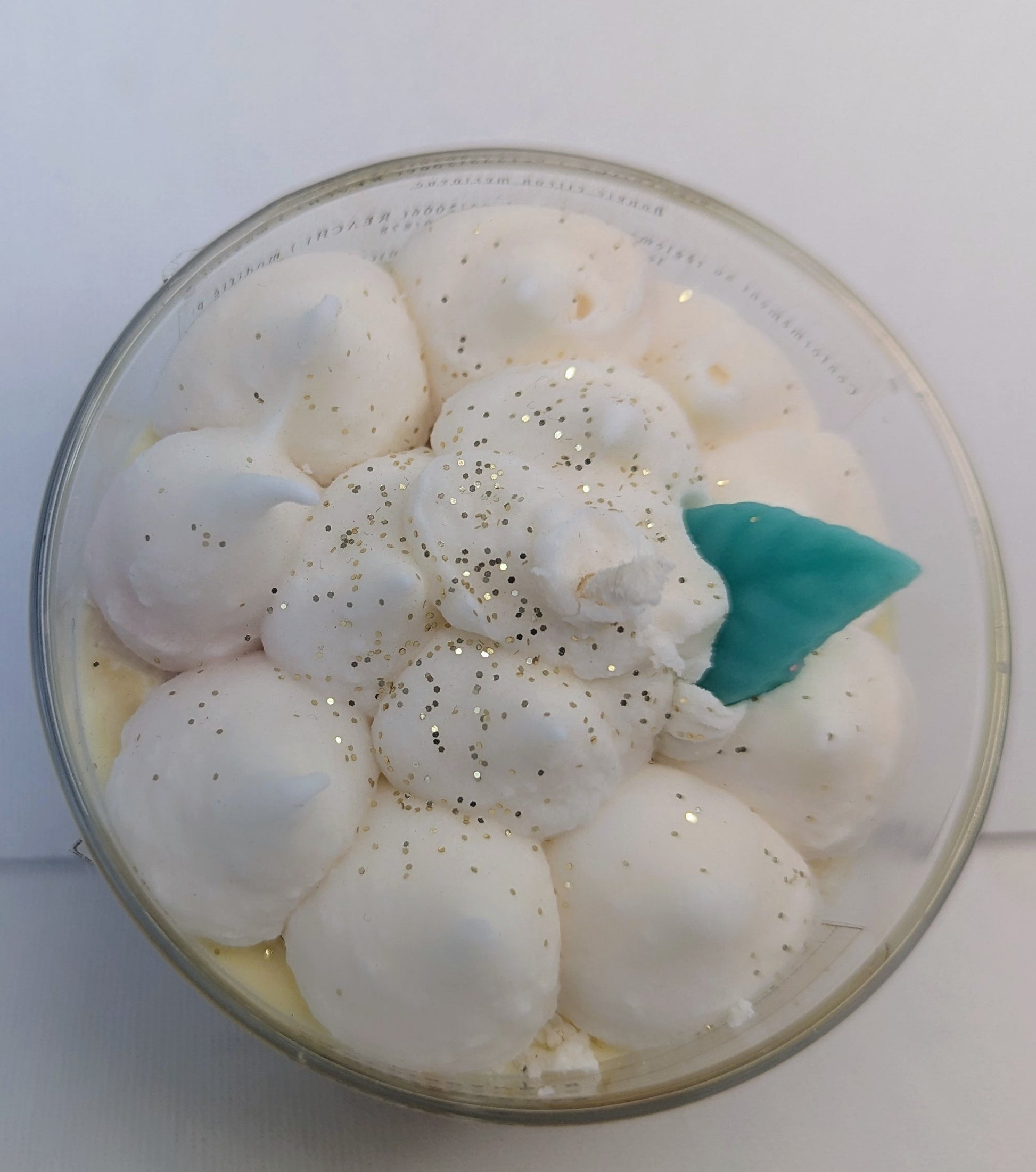 Cire de soja végétale, décorations faites en cire de colza. et mèche en coton. Contenant en verre.